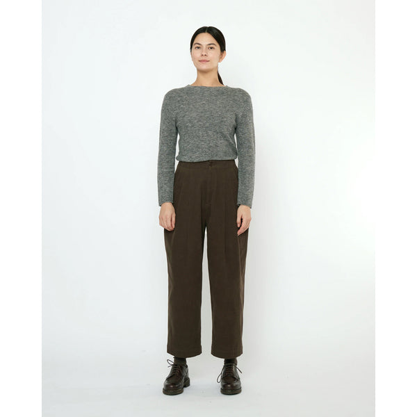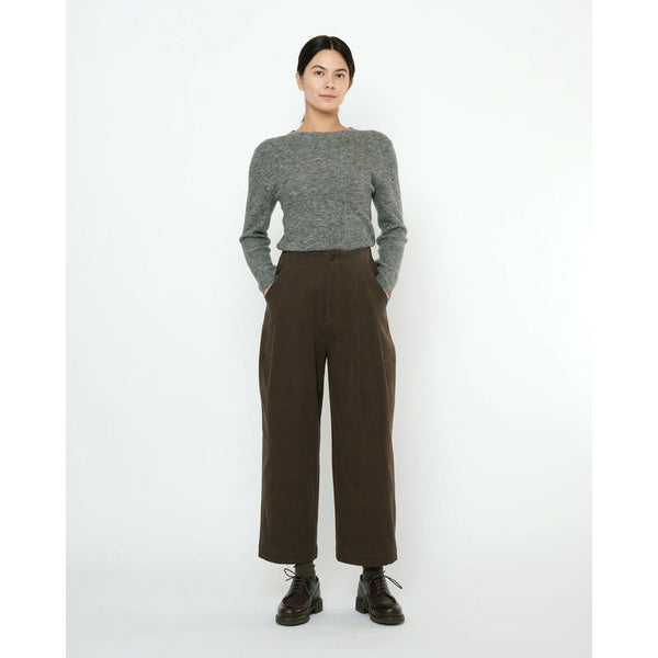 High waisted trouser in a medium weight cotton twill with a soft, brushed hand. Features sewn-in pleat detailing, an elasticized back waistband, and a loose, relaxed leg shape. Side and back pockets. Unisex. Flattering and easy.