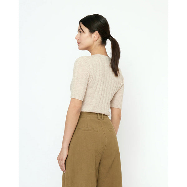 Simple and sophisticated lightweight ribbed knit tee in buttery soft extrafine merino wool. Features a scoop neckline and short sleeves. An elevated wardrobe essential.