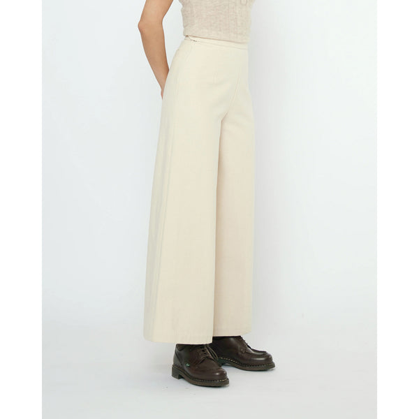 Tailored and refined wide leg trouser crafted out of a sturdy and structured cotton and linen blend that almost feels like canvas. Flattering high-rise silhouette with side-zip and single button closure for cool, minimalist appeal.