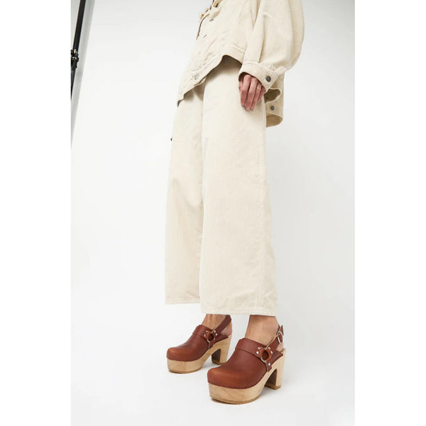 Vintage motorcycle clog on a chunky platform base. Features a classic silver ring harness across the top and an adjustable back strap that can be worn high on the heel or dropped low enough to wear as a slip on. Surprisingly comfortable and walkable. We love them paired both with and without socks.