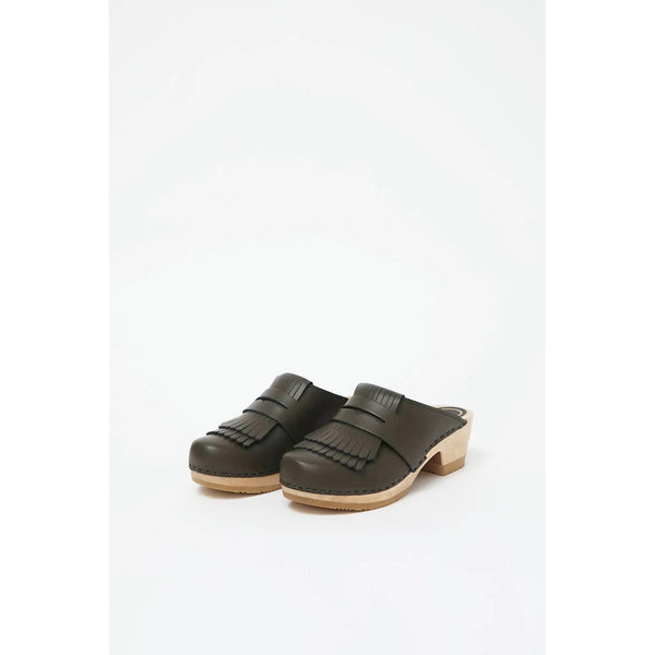 Classic everyday slip on clog with penny loafer and kiltie detailIng. Leather upper sits on a comfortable and walkable mid heel base. Lightweight and easy- we love them paired with and without socks.