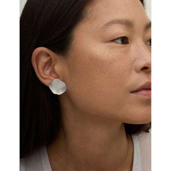 Organically shaped sterling silver studs with a lustrous satin finish. One of a kind. Approximately 22mm in diameter- a little less than the size of a quarter. Sold as a pair.