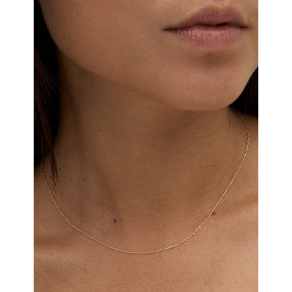 Extra fine chain necklace in solid 14k yellow gold. Features a 0.4 mm gold cable chain with a spring clasp. Measures 16" long.
