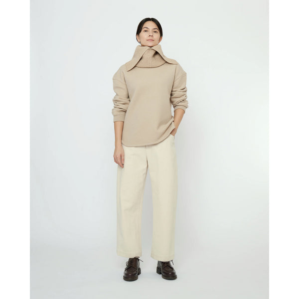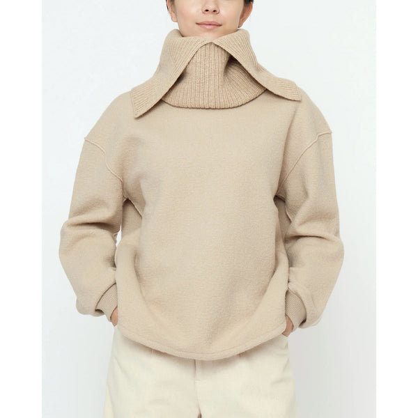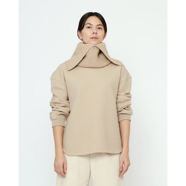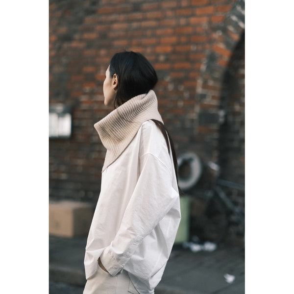 Versatile neck warmer that is part infinity scarf, part collared shawl. The v-neck opening on one side allows for various custom styling options to complement your coat's collar. Made from a luxurious mix of yak and responsible wool standard (RWS) merino wool. Soft and warm. One size.