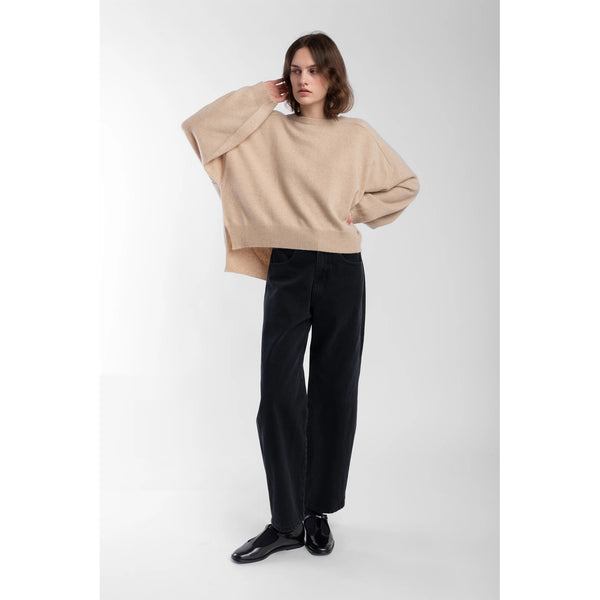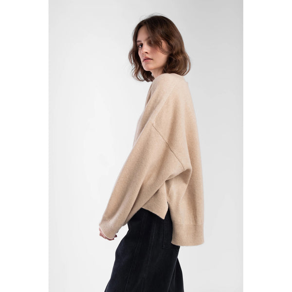 Soft and luxurious mid-weight cashmere pullover. Features a saddle sleeve, side slits, and a high low hemline. Especially lovely worn over a dress or with a skirt.