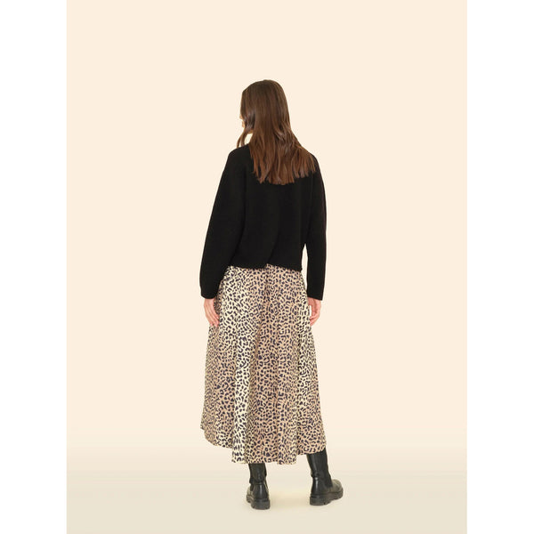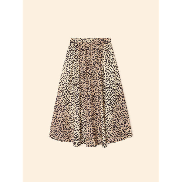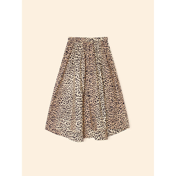 Leopard print maxi skirt in cotton paper poplin. Pull-on silhouette with an elasticized waist, side seam pockets, and a high-low hem.