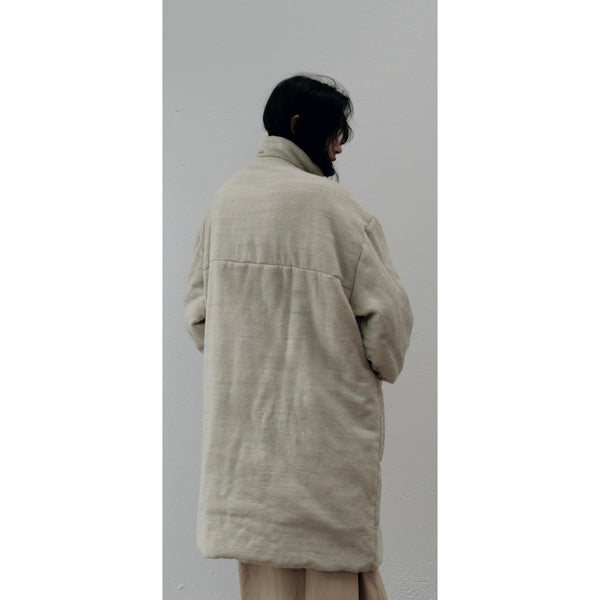 Oversized quilted coat in mottled woven virgin wool. Lined with a lightweight organic cotton canvas and quilted with wool wadding. Features a stand-up collar, wrap-around neck with a single horn button closure, and two large quilted front pockets.