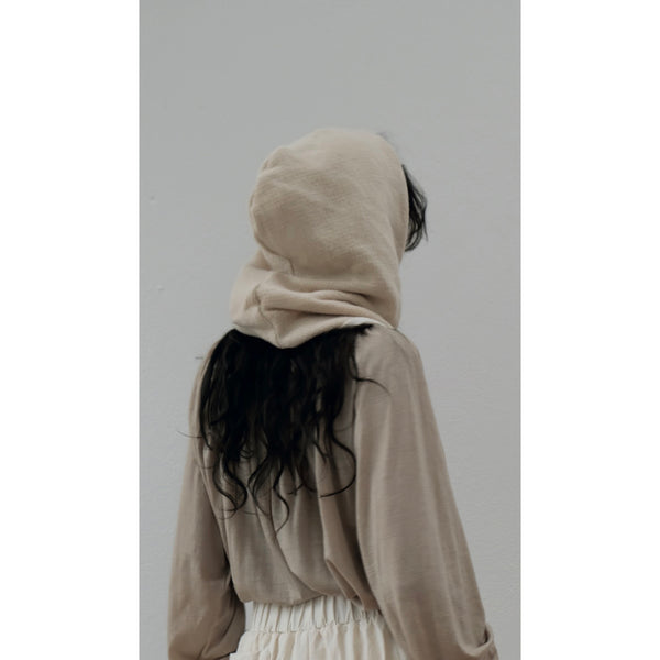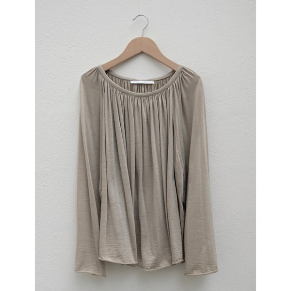 A loose, feminine top in a very fine, fluid wool jersey. Features a gathered scoop neckline, raglan sleeves, and naturally rolled edges.
