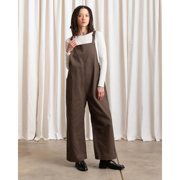Season-less overall in chocolate cotton canvas. Features a straight, streamlined silhouette, oversized patch pockets, and adjustable straps. Effortless and easy. Comfortable, relaxed fit.