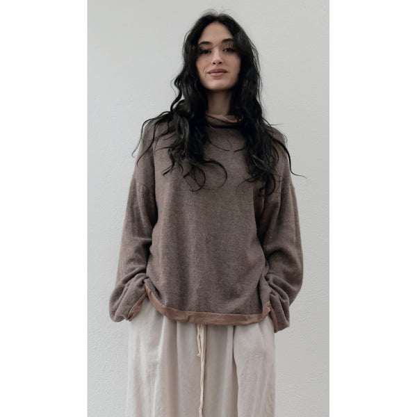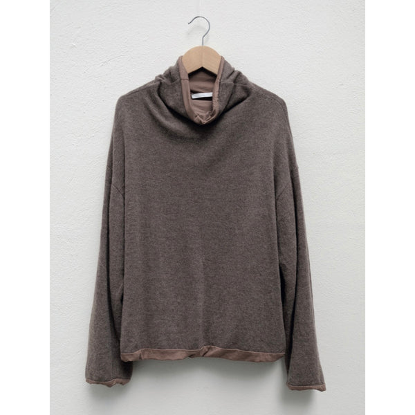Fine knit wool sweater fully lined with organic cotton jersey. Features a seamless stand collar and drop sleeve.