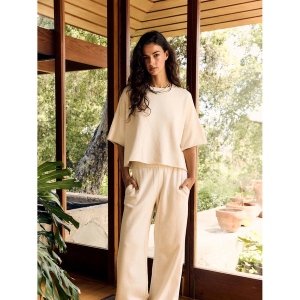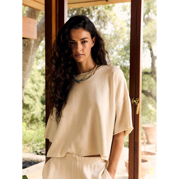 Pullover sweatshirt in soft cotton fleece. Features raw edge elbow length sleeves and a raw hem. Easy, boxy fit.