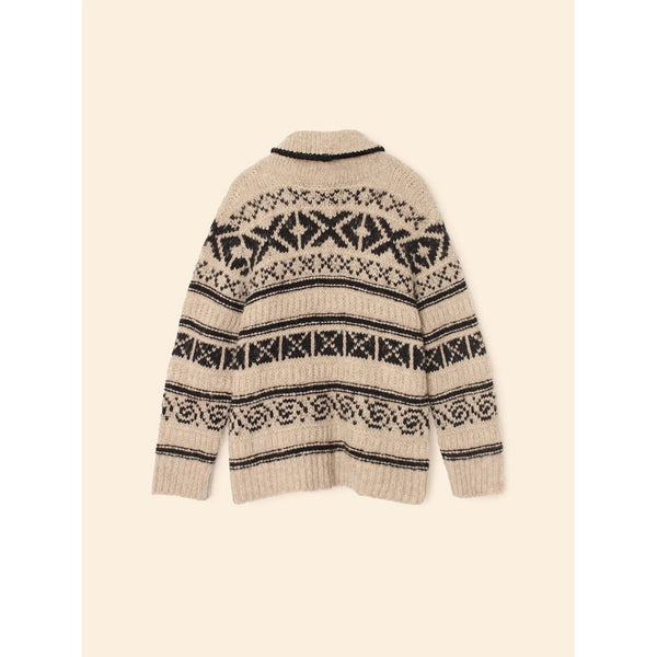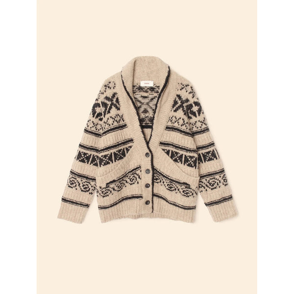 Fair isle cardigan in a soft superfine alpaca. Features a button front closure, patch pockets, and a shawl collar. Like the best vintage find, but better.