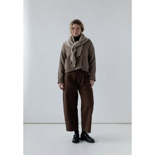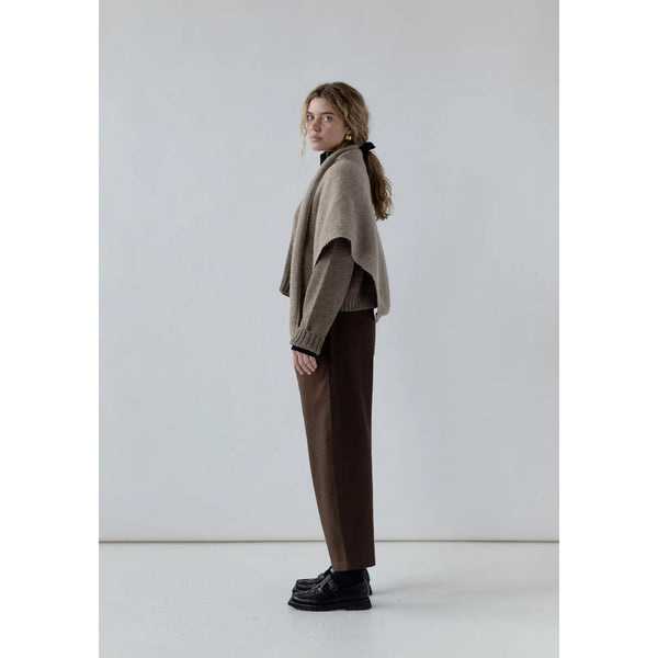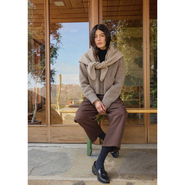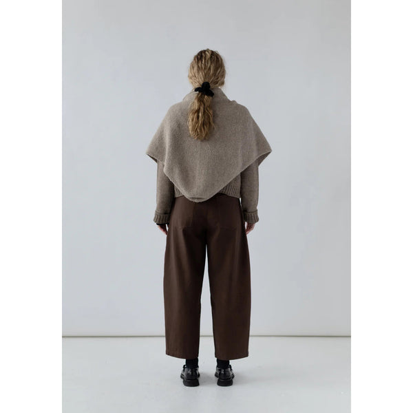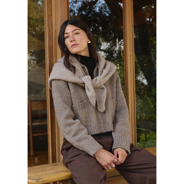 Versatile triangle shawl in undyed felted baby alpaca. Wear it as a wrap, head scarf/ hood, or neck scarf. Fair Trade certified. Measures approx 62"W x 29"H.