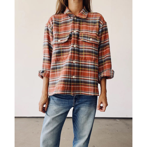 Updated classic work shirt in a timeless rust plaid. Nice light blanket weight made with 100% Japanese cotton dobby. Relaxed, vintage feel. Works as a jacket, over shirt, or on it's own. Easy, boxy fit.