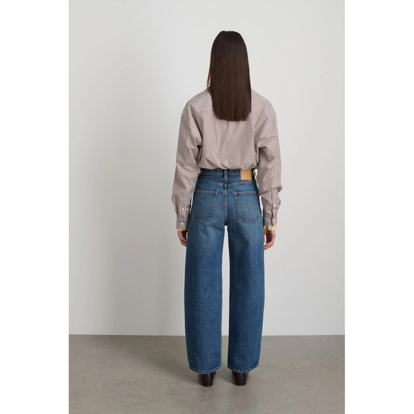 True blue indigo denim jean with an arched leg shape. Sits just below the natural waist with a relaxed hip and a subtle barrel-legged silhouette that tapers for a slim, finished look. A great everyday jean. 29" inseam.