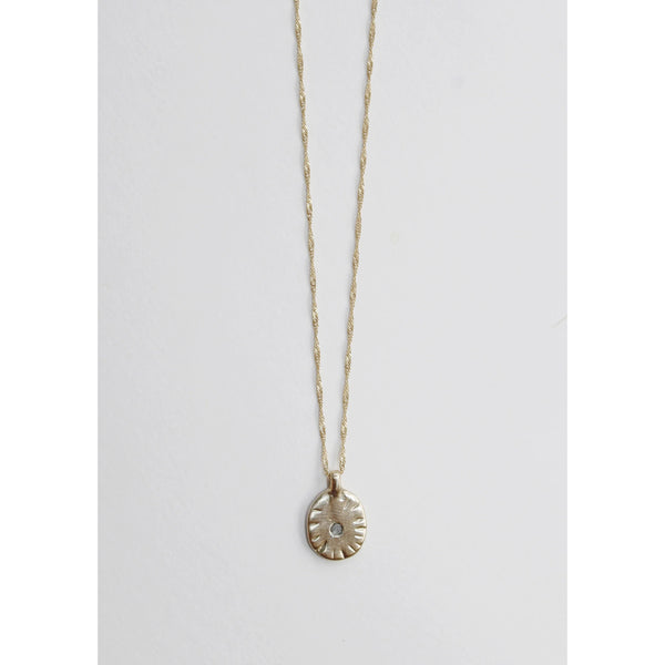10k gold pendant frames a tiny conflict free white diamond at its center. Hand-carved and cast. Hangs from a delicate 16" chain. A piece to wear and treasure.