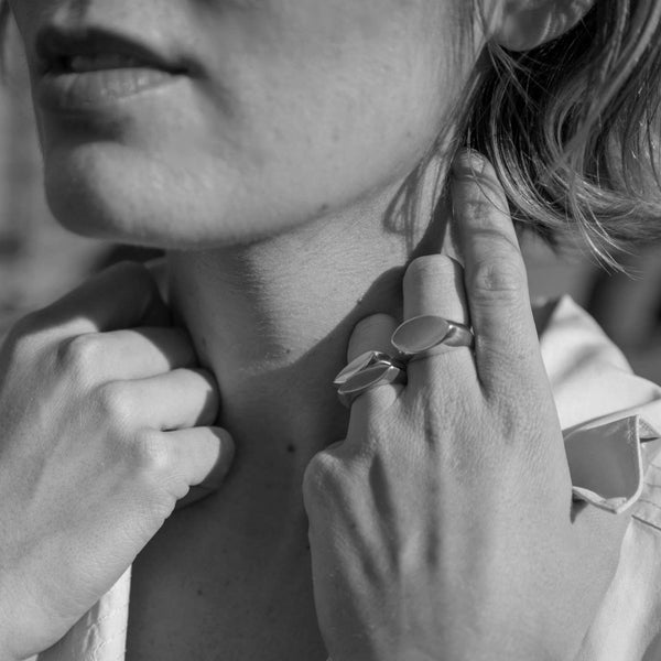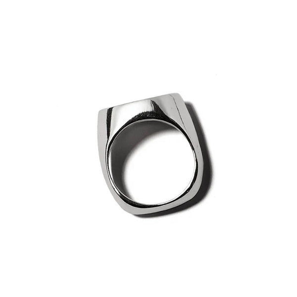 Hand-carved signet ring in sterling silver. A high profile and a beveled, square shaped band lend a contemporary feel to a classic shape. Available in size 7.