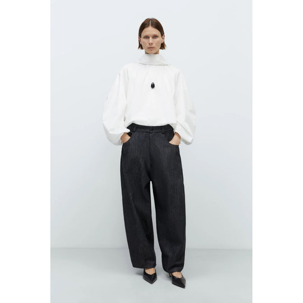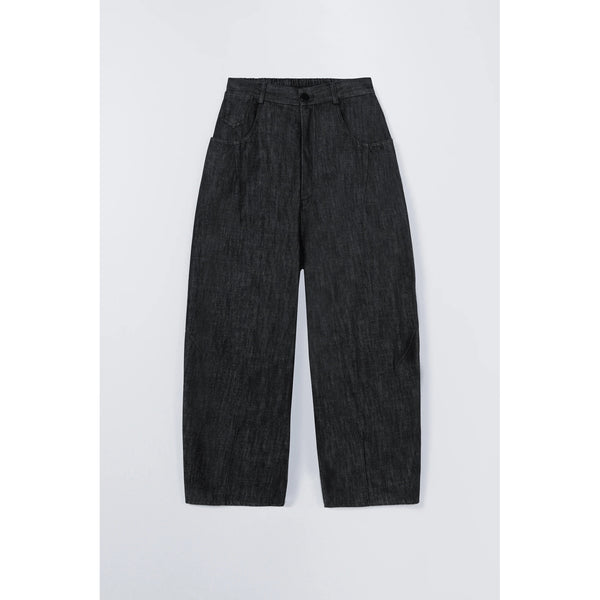 Structured everyday pant in black organic cotton denim. Features a loose, comfortable fit, a long curved leg shape, elasticated back waistband, and side + back pockets. Easy and relaxed.
