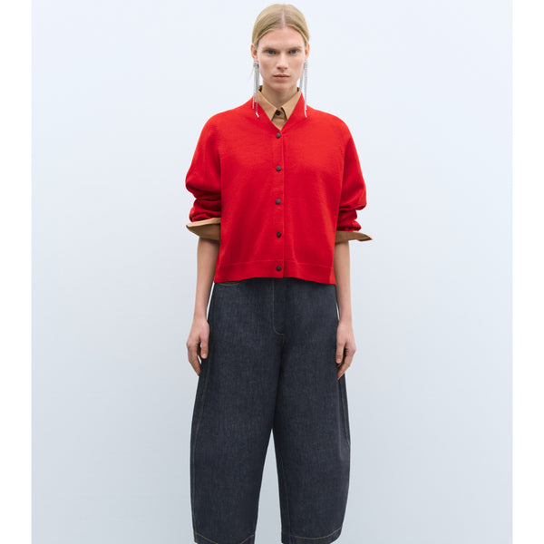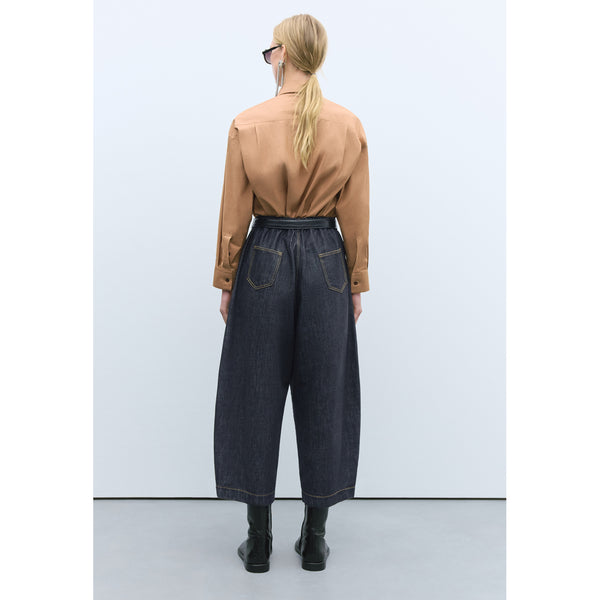 A perfect everyday jean in black organic cotton denim. Features a high rise silhouette, an elasticated back waistband, and an exaggerated curved leg shape. Designed for everyday, year round wear.