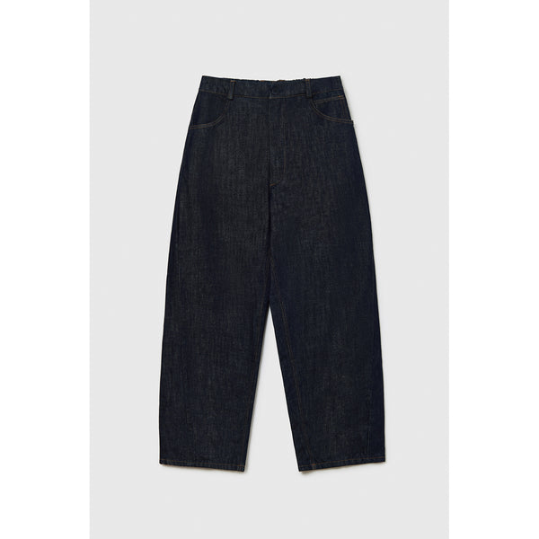 Everyday cotton denim pant in a lovely dark indigo rinse. Features a high rise with an elasticated back waistband and a straight leg with curved, sweeping seams. Finished with a zip fastening, top button closure, belt loops, and pockets.