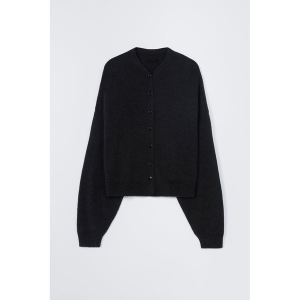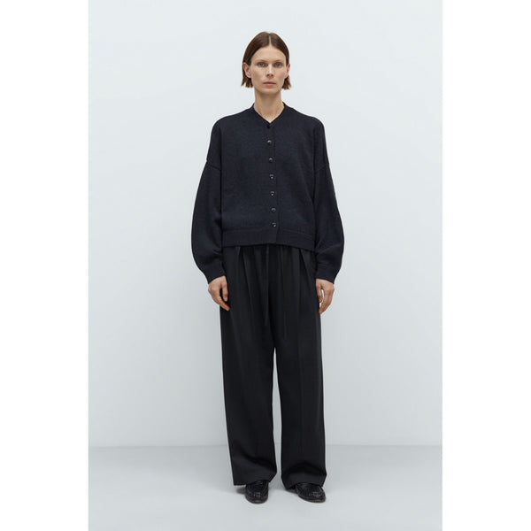Elevated everyday cardigan in soft and warm extrafine merino wool. Loose, drapey, and flattering. Slightly cropped, with a v-neck line, horn buttons, and rib trim detailing. A favorite silhouette. One size.