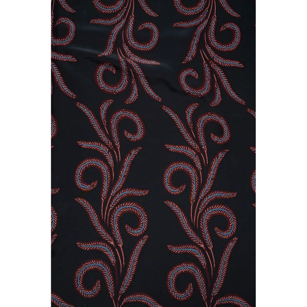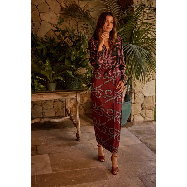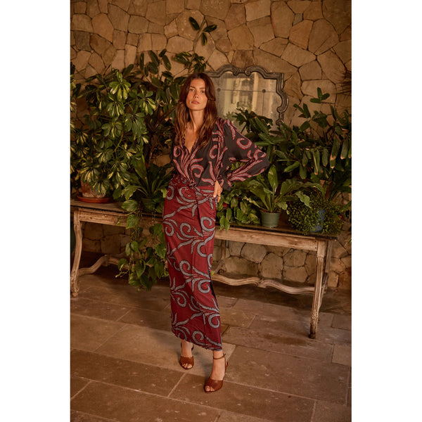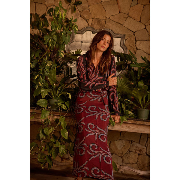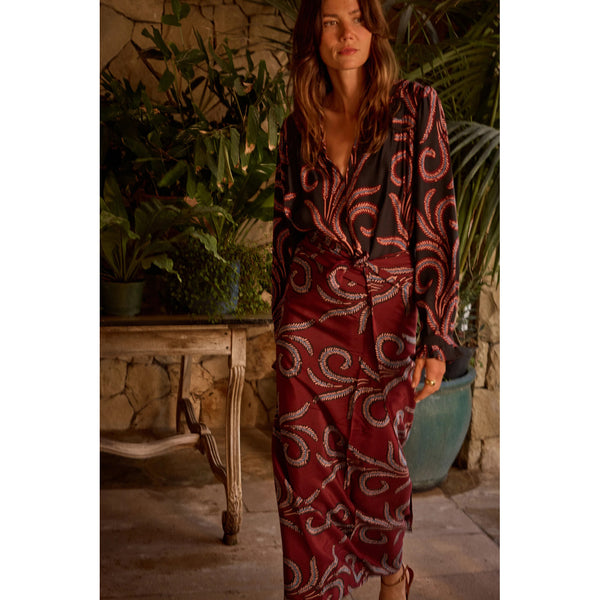 A delicate, feminine blouse in black printed silk. Features gathered shoulders, a deep keyhole neckline, and a ruffled collar with a button front closure.
