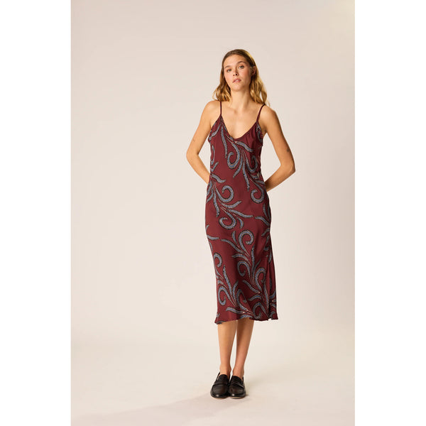 Simple, elegant slip dress in printed silk. Features slim, adjustable straps and a midi length silhouette.