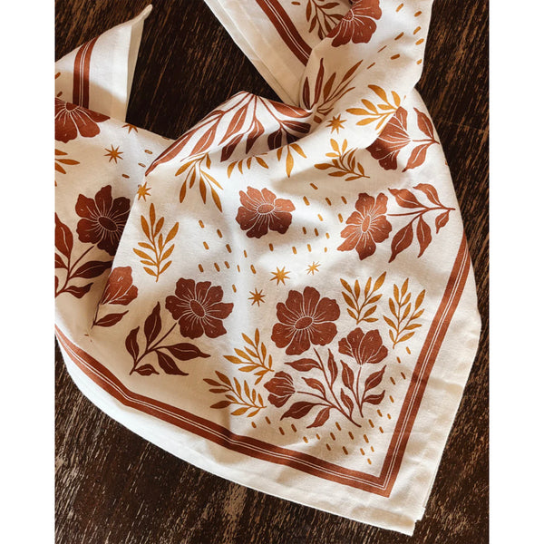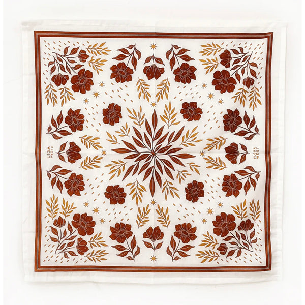 Classic organic cotton bandana in an elevated neutral floral, reminiscent of vintage Western wear. Features a hand drawn illustration in warm clay and ochre on a soft white background. Measures 23” square - slightly larger than a standard bandana.
