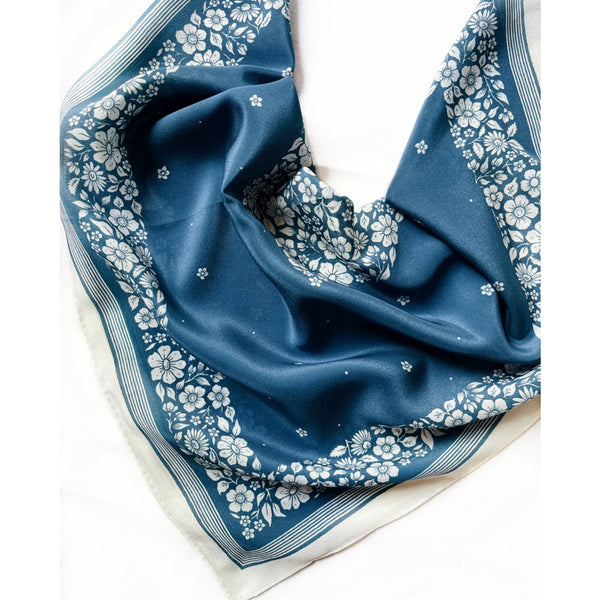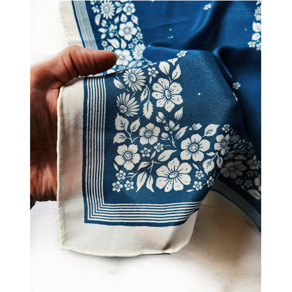 Blue and white floral bandana evocative of the Grecian coast in luxurious silk crepe de chine. Features a thoughtfully placed assortment of hand- illustrated florals designed to have the same aspect whether rolled up or folded diagonally. Measures 23” square - slightly larger than a standard bandana. Finished with a beautiful hand rolled hem.