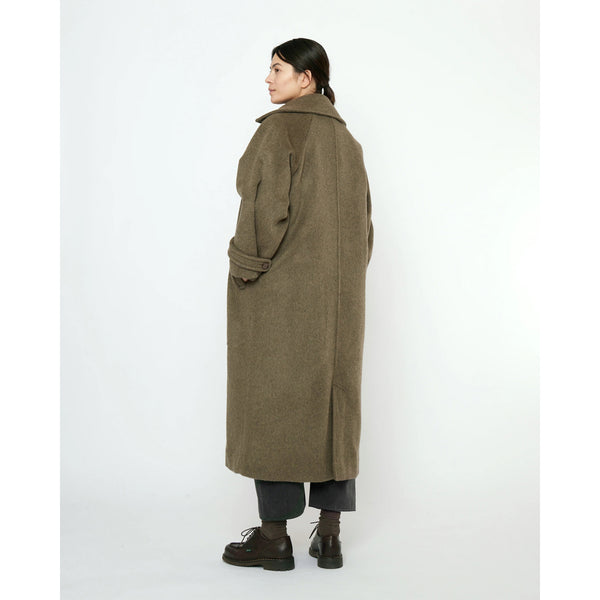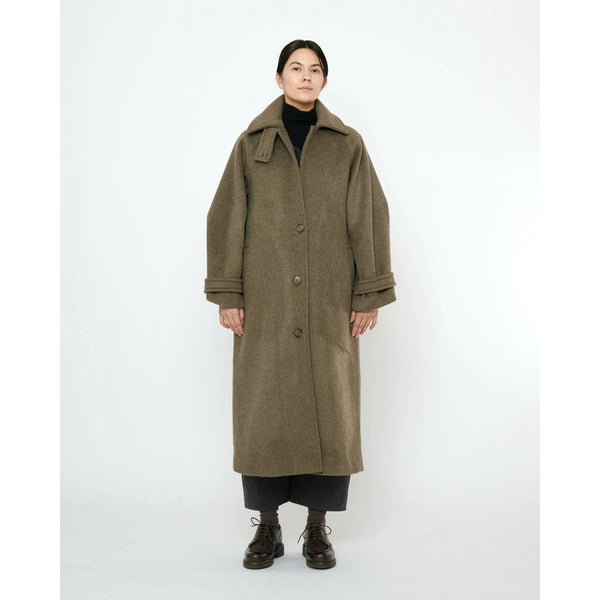 Classically tailored full-length balmacaan coat in a lofty wool + alpaca blend. Fully lined. Features a prussian collar, raglan sleeves, and slash pockets. Relaxed fit; cut for easy layering.